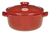30 percent lighter than many types of comparable metal cookware products, Flame-Top is dishwasher-safe and cleans up very easily.Oven, broiler, microwave safe, it can go directly from a freezer or a refrigerator to a hot oven to the table, where it will retain the cooking heat for a very long time.Can be left on an open flame, at high temperatures without any ingredients in the pot and the pot will not crack or break .Raised dots on the underneath side of each lid evenly distribute evaporated juices directly back into the cooking food produces a more thoroughly cooked, tender and moist dish.Made of Burgundy clay, can be used directly on a gas flame, an electric or halogen hob without a diffuser and without any fear of cracking or breaking. Emile Henry Flame Top cookware, a technological innovation. An innovation in ceramics technology, Emile Henry's new line of Burgundy Clay Flame-Top ceramics products work directly on a gas flame or an electric or halogen hob without a diffuser, without any fear of cracking or breaking. Much lighter, (30%), than many types of comparable metal cookware products, Flame-Top is microwave and dishwasher-safe, cleans up very easily, is extremely strong and durable, goes under the broiler, and can go directly from a freezer or a refrigerator to a hot oven to the table, where it will retain the cooking heat for a very long time. This recent innovation from Emile Henry is a break-through in ceramics technology. Unlike most metal cookware products, Flame-Top cookware can sit on a very hot open flame for an extended period of time without any ingredients in the cook pot, and they will not crack, discolor or break. Perfect for braising, browning and slow cooking due to the incredibly gentle heat distribution properties of Burgundy Clay, Flame-Top products cook evenly and thoroughly when used on top of the stove, in the oven or even in the microwave. Enhancing this gentle cooking action are raised dots on the underneath side of each lid that evenly distribute evaporated juices directly back into the cooking food. This self-basting technique produces a more thoroughly cooked, tender and moist dish than with traditional lids, which force liquids to run down the sides of the pot, and which contribute to uneven cooking. Emile Henry Flame-Top ceramic cookware is light and versatile, and better brings out the flavors of all cooked foods.